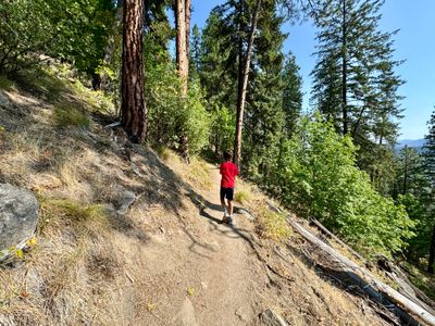 We were treated to nice views of Leavenworth at the end of the trail. I thought perhaps we would also be able to see the mountain coaster, but it was situated on a slope not visible from this vantage point. Given there was no shade on this section, we opted to head back towards the trail junction, and find a couple nice rocks to sit on in the shade.